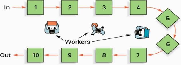 產品原則布置是根據產品制造的過程安排各組成部分,機器設備、人員及物料按產品的加工或裝配的工藝過程順序布置,形成一定的生產線。適用于小品種、大批量的生產方式。