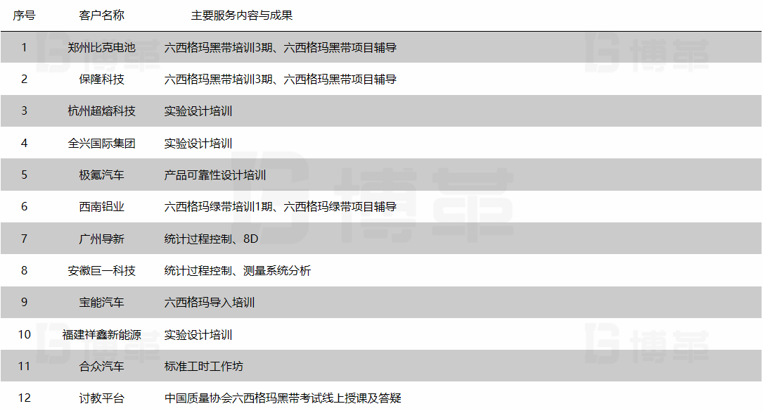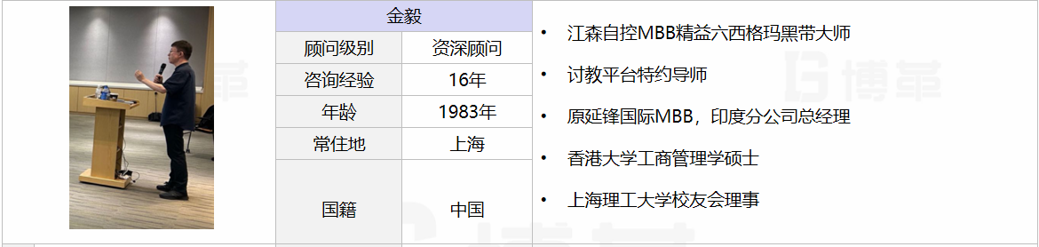 咨詢能力介紹  20年歐美企業工作經驗,負責眾多 6Sigma項目和其他改善活動; 培訓及輔導企業:極氪汽車、寶能汽車、比克電池、保隆科技、全興國際、巨一動力、合眾汽車、超熔科技等; 成功輔導超過近百名黑帶和六百多名六西格瑪綠帶。曾為中國多家知名企業及國際化集團公司導入近百個六西格瑪改善項目;累計為企業帶來超過近千萬的改進收益;