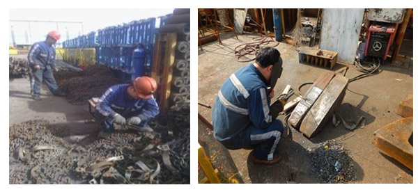 ♦ 井下回收上來的水管吊掛鏈及水管卡子螺栓銹蝕嚴重,在井下無法分離,回收組組織進行用氣割將其連接處割開,將鏈子和水管卡子分類碼放,以便再用