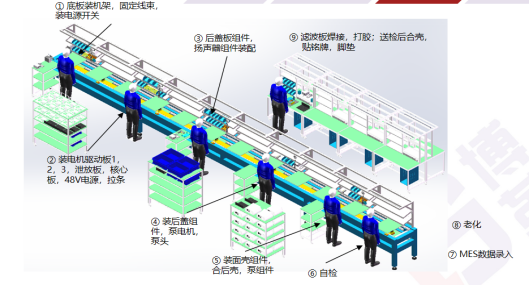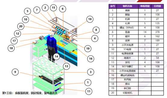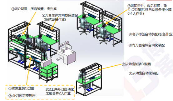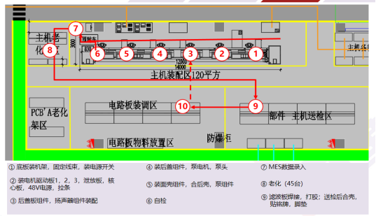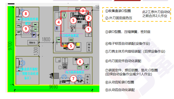 通過連續流布局,配配用設備嵌入生產線,減少生產斷點與搬運,斷點由12降到3個,生產過程搬運距離由860米降到60m