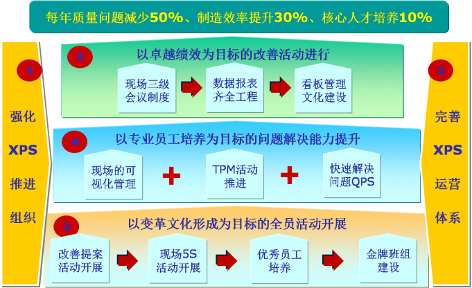 XPS系統架構分由理念、原則、模型、目標、要素、要求部分構成,其理念為:“XPS-A持續變革系統”是以A集團及下屬企業戰略為導向,結合企業運營的具體情況,運用世界上最行之有效的績效改善工具和方法,幫助企業建立和完善高效的運營系統和模式-XPS持續變革系統,使企業在產品創新、流程創新、人才培養、利潤創新等方面的績效達到世界領先水平,并形成與企業自身文化相融合的持續改善文化,構筑企業的核心競爭力。“