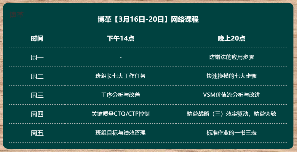 為助力企業(yè)在抗疫期間的穩(wěn)健發(fā)展,博革咨詢特推出騰訊課堂線上直播《金牌班組長培訓》《企業(yè)精益戰(zhàn)略實施》《精益工具應(yīng)用》等內(nèi)訓精品課程,與您共渡難關(guān)!