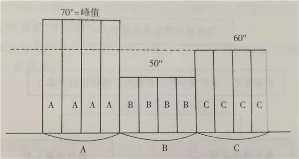 例如,像在圖5.5中看到的那樣,在同一條裝配生產(chǎn)線上某工序的裝配工時產(chǎn)品A是70秒、產(chǎn)品B是50秒、產(chǎn)品C是60秒的情況下,如果按圖中A-B-C一A-B-C的順序流動,在平均節(jié)拍時間為60秒的情況下生產(chǎn)線也不會停車,但是像在圖5.6中所看到的那樣,如果所需工時多的產(chǎn)品A成批量演動,在節(jié)拍時間為60秒的這條生產(chǎn)線上,作業(yè)在節(jié)拍時內(nèi)處理不完,就會發(fā)生生產(chǎn)線停車的情況。為了不發(fā)生生產(chǎn)線停車,就要像用更短的節(jié)拍時間能夠處理70秒高峰作業(yè)的產(chǎn)品A那樣,不得不增加人員了。