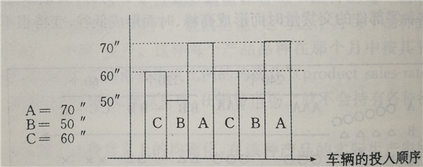 這種裝配工時的均衡生產(chǎn),從實現(xiàn)各種裝配工時的汽車平均出現(xiàn)率(該工時車的輛數(shù)全部車的總輛數(shù))的觀點(diǎn)來看,也可以用與按品種的數(shù)量均衡同樣的方法來編順序。