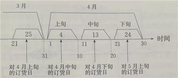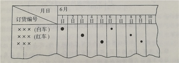 步驟1 來自銷售商的旬訂貨,各銷售商在汽車廠基本生產(chǎn)計劃確定的本月領取輛數(shù)的范圍內,將最終分規(guī)格的10天份的訂貨在7天至8天前通過微機聯(lián)網(wǎng)提供給汽車廠的銷售部門(參看圖1)。所謂最終規(guī)格,就是將剛才講過的按大分類的規(guī)格的車型,進一步通過對任選部件(訂貨要求的裝備)的選擇、車的顏色的選擇細分后的規(guī)格。接著,在生產(chǎn)管理部門按照旬訂貨來計劃分工廠,分生產(chǎn)線的日產(chǎn)量,這就是對前面所講述的基本生產(chǎn)計劃的修正,另外,豐田汽車公司還要向各家銷售商報告圖2那樣的配送預定表( Delivery Schedule),這個預定表的編制,從接受旬訂貨開始需要兩天的時間。